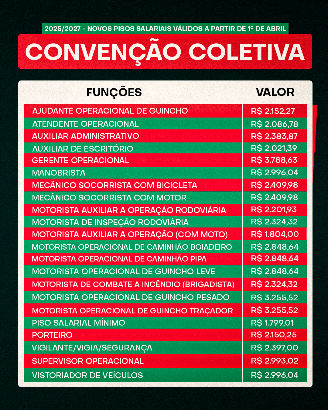 CONFIRA ABAIXO A TABELA COMPLETA DE SALÁRIOS VIGENTE A PARTIR DE 1º DE ABRIL DE 2026